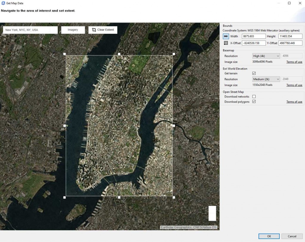 Click OK once you’ve set the extent & the resolution of your basemap/terrain, and checked the download Polygons box (to download building footprints within the Area of Interest).