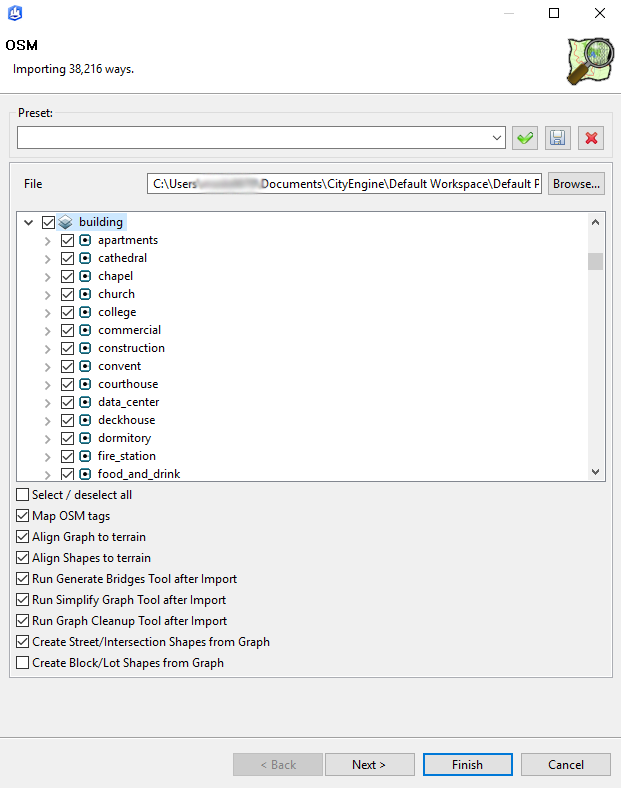 Now, you have the option to pick and choose which Open Street map layers you want to bring into your CityEngine Scene.