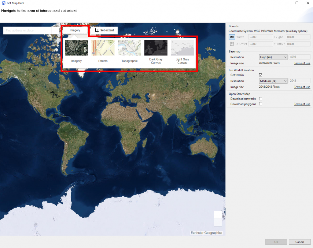Before setting the extent of the area of interest, you have the option to choose which basemap you want to download. The default selection is Esri’s Imagery, however, you can also choose between several other basemaps (such as streets, dark theme, light theme, etc.) by clicking the dropdown highlighted below.