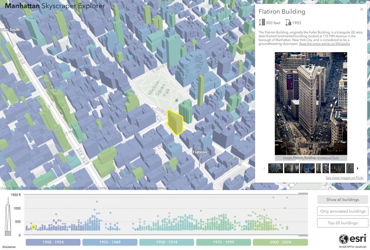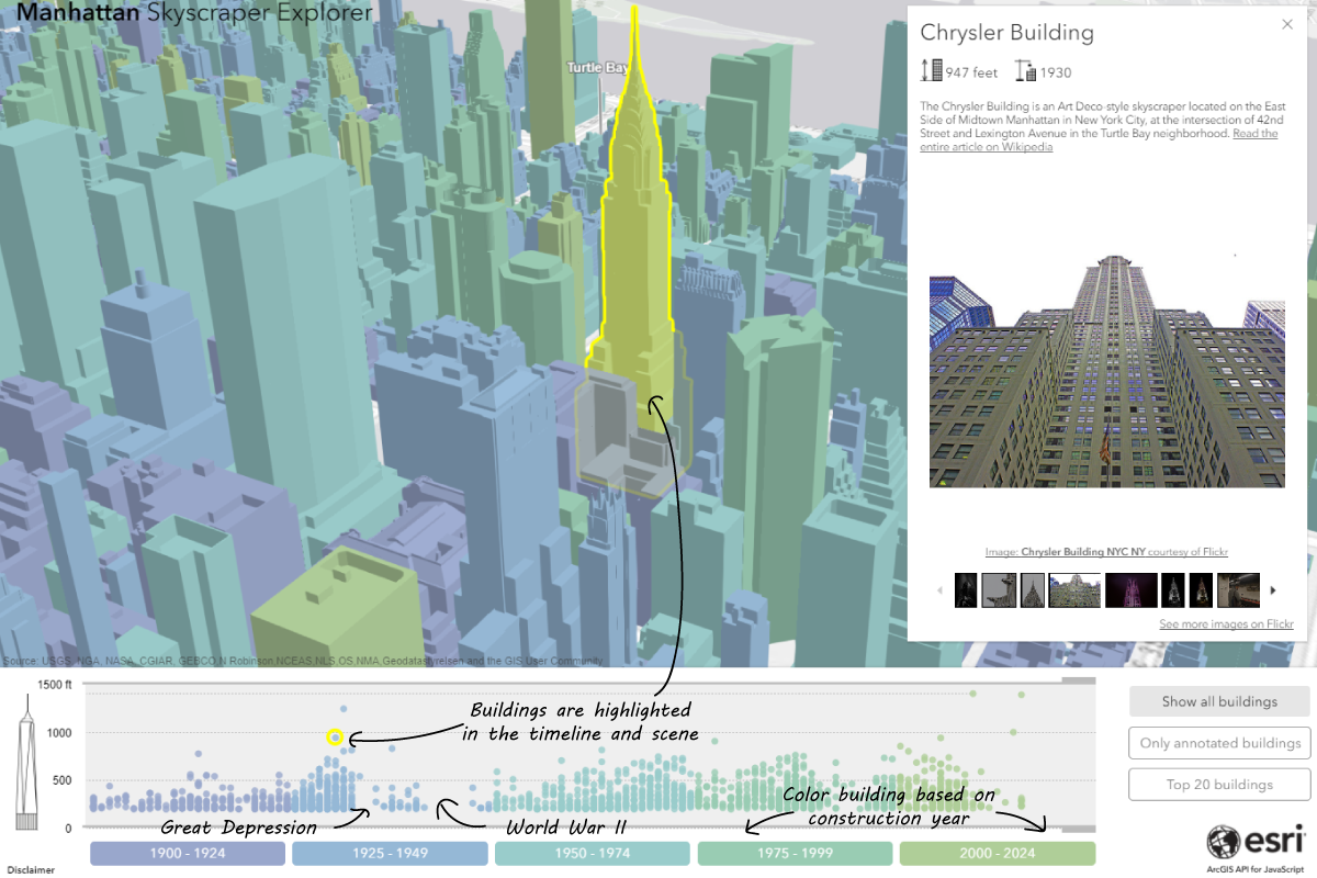 This was also my goal when I started building the Manhattan Skyscraper Explorer. I focused on Manhattan, because I was mostly interested in the highest and most popular buildings in New York: when were they built? how tall are they? what do they look like? what are they currently used for?