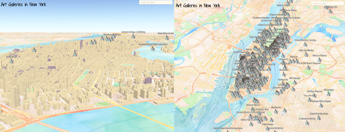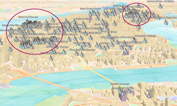 In this dataset there are 917 art galleries and many of them are inside buildings. Therefore icons will be hidden by buildings when looking at the scene in a detailed tilted view (see image below on the left). In a smaller scale view of New York, the icons fully cover the scene (image on the right).