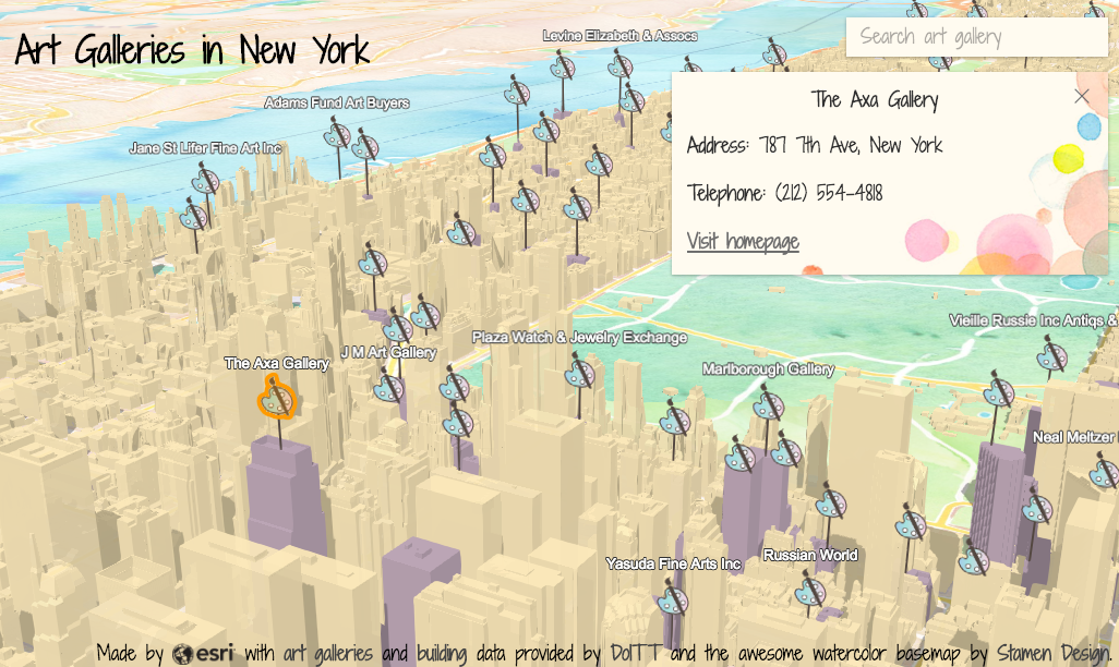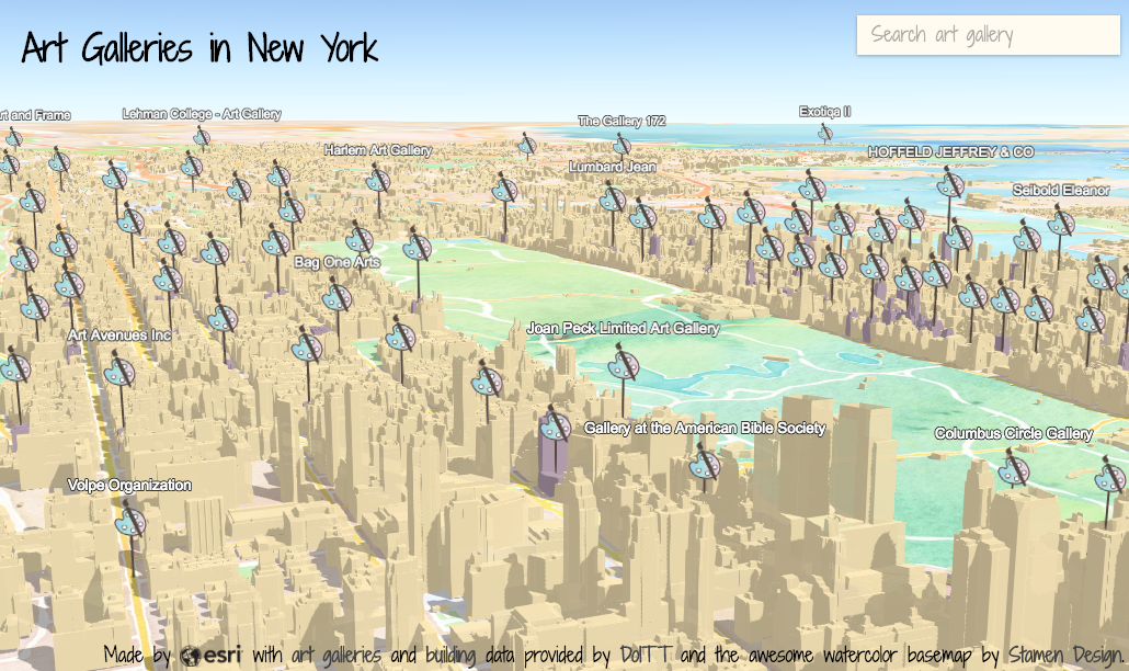 I regularly check the Open Data portals because there’s always some new, interesting dataset out there. Recently, I stumbled upon data of independent art galleries in New York City on the NYC OpenData portal and decided to create a scene with them. I was amazed that New York City has so many art galleries…especially in Manhattan. I wanted to give more context to the scene, so I also downloaded the NYC building data. Since this is a scene about art, a natural choice for the basemap was the Watercolor basemap from Stamen. See a live demo here.