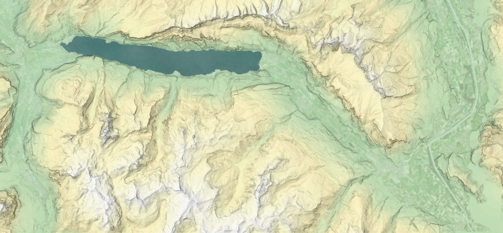 Here you can see a hypsometrically tinted and hillshaded example of terrain for the Wallensee region in Switzerland.