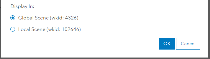 When publishing scene layers from feature layers you have the option to publish scene layers that can display in global or local scenes. If your feature layer is in a projected coordinate system you can choose to have the scene layer published so it can display in local scenes. Next to the Global and Local option you will see display options which include WKID references. This is the WKID is the well known ID of the spatial reference of the feature layer. This The spatial reference is important to know what spatial reference you will want to publish the scene layer in because the scene layer is not cannot be reprojected like tile and elevation layers. If you are using any other cached layers (such as tile layers, elevation layers or scene layers) in your web scene, you will want to make sure the WKID matches because they cannot be reprojected and need to be in scenes with all the same spatial reference. Geographic coordinate systems outside of WGS84 are not supported in Scene Viewer today. This means data that is in a non-WGS84 geographic coordinate system only publishes to WGS84 (so you do not see the global/local display option). The output scene layer is automatically published in WGS84 and can be used in a global scene (only).