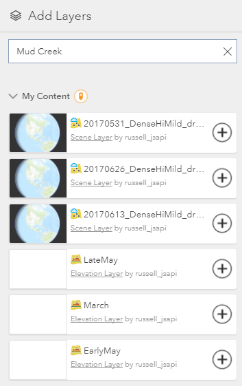 Now that I have all my layers published to ArcGIS Online I can begin to create my web scene. When I uploaded the slpks and tpks to My Content I used the tag “Mud Creek” so the published layers will also have those tags and when I go to add layers in Scene Viewer all I need to do is search my tag and I will see the hosted layers under My Content.