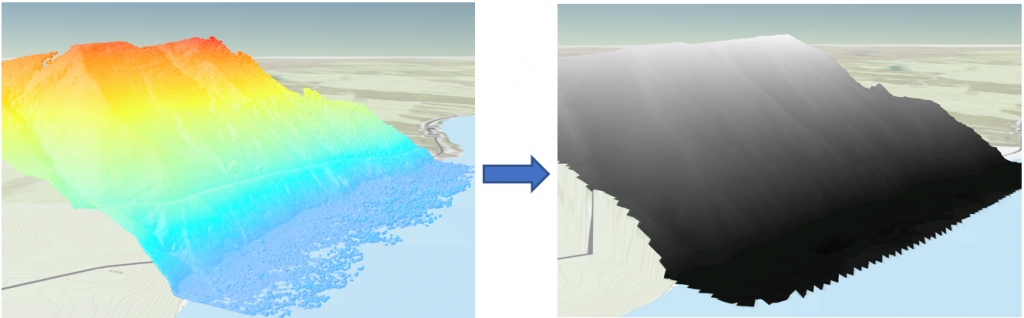 To create the raster that will be used to publish the hosted elevation layer I used the LAS dataset to Raster. This will take the LAS datasets for the different stages of the Mud Creek landslide and covert them to a Raster dataset.