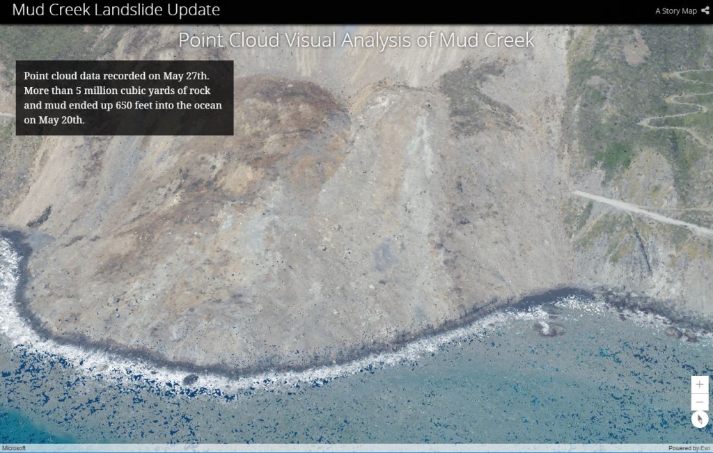 Recently Bernie posted a blog showing how you can use web scenes in different Story Map templates. I am going to show you how I created a Story Map using a web scene showing the progression of the Mud Creek landslide over 2017 with point cloud scene layers. In this blog I am going to go over how I created point cloud scene layers, elevation layers, a web scene with slides and the final story map.