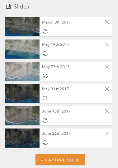 The last thing I want to add to my scene are slides. I am going to use these slides to direct the user to see various stages of the landslide with the correct point cloud scene layer and corresponding elevation layer. To add a slide click on the Slides button in the Layers pane and when you have the layers enabled and the camera view you wish to have as the slides initial view click the capture button. I gave the slides a helpful title so the users can see what point in the timeline this slide is should represent. Now the users of this web scene do not need to use the Layers tool to view the various stages and they can use the slides to navigate the scene.