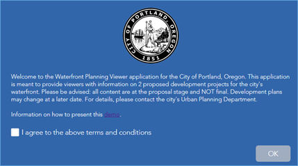 The web scene displayed in the app shows the City of Portland, OR waterfront with one of the proposed development scenarios (B), which represents a proposal of mixed-use buildings.