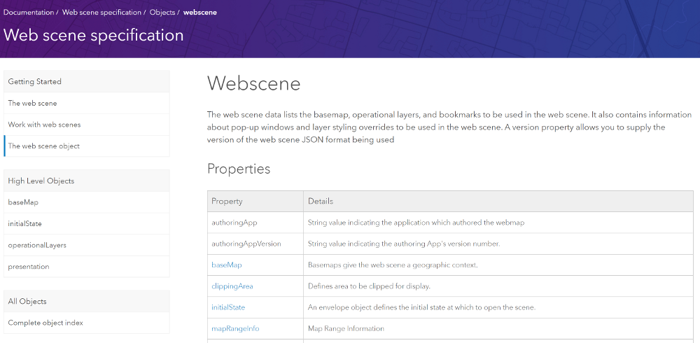 The specification is a guide for authoring, editing and consuming web scenes. It provides information on what properties are supported and how they should be used. We want anyone to be able to write applications that can read and write web scenes, so this week we released the web scene specification and we made it publicly available here.