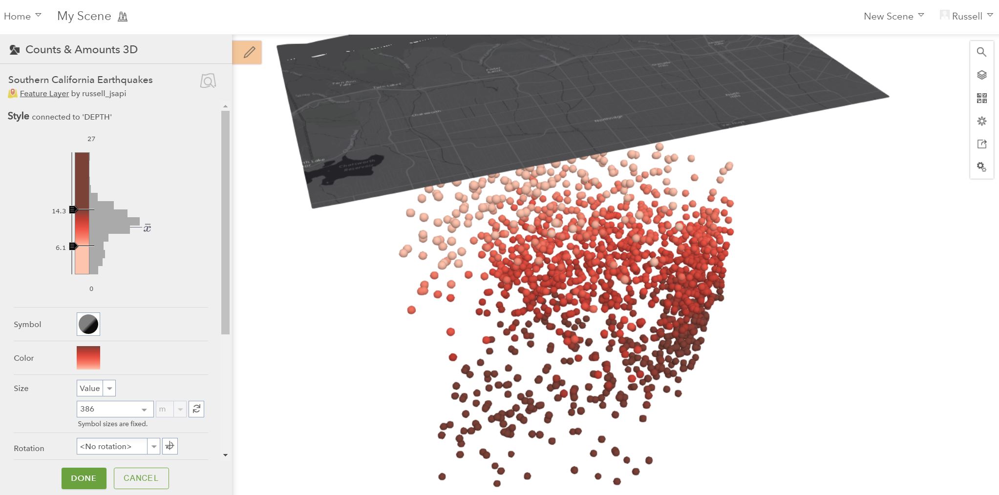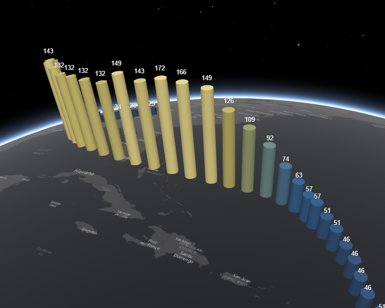 This release is marked by Scene Viewer adding smart mapping capabilities similar to those in Map Viewer. You can apply 2D and 3D styles to your layers that emphasize the features in a more uniform way or symbolize the data with real-world sizes based on the attributes of your data. You can also utilize counts and amounts styles to use the attributes of your point data to drive the appearance of your features. All this makes it easier for you to create attractive web scenes which can be leveraged in templates, Web AppBuilder, story maps, or in custom applications built on the 4.x JS API. Here is a sample of a local scene using smart mapping styles to give earthquakes a continuous color showing the depths of recorded seismic activity.