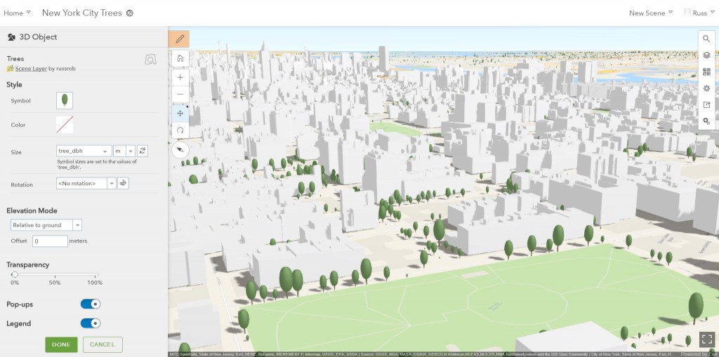Now in ArcGIS Enterprise 10.5.1 when you add styles to your point layers, you can select from a wide gallery of 2D and 3D symbols. For example, you could choose to use realistic or thematic tree symbols in your scene. Check out this scene of New York City with a 3D Object scene layer of one million buildings and a point scene layer with just under 450,000 features. The points use 3D thematic tree symbols with their height and size driven by their recorded height attribute.