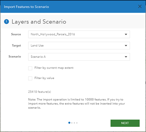 - Use filters in the Import Scenario tool: At the bottom of the first screen in the Import Features to Scenario dialog box, you’ll see two options for filtering features: Filter by current map extent and Filter by value. You can use one or both options to limit the number of features you import into the scenario at once. Filter by current map extent limits the features imported to just those that are visible in the existing map extent, whereas Filter by value limits features based on an attribute value for a particular field. For example, you can filter features by their values of either residential, commercial, or industrial for the field Land Use Type.