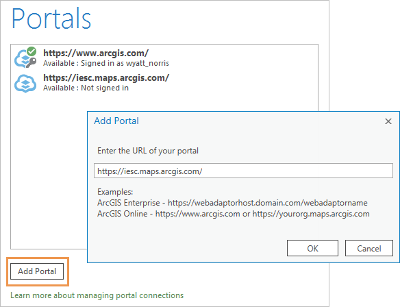 I explained how he could view his portal connections. From an open project, he clicked the Project tab on the ribbon and then clicked Portals. (He also could have clicked his Sign-in Status in the upper right corner of the Pro window and clicked Manage Portals.)