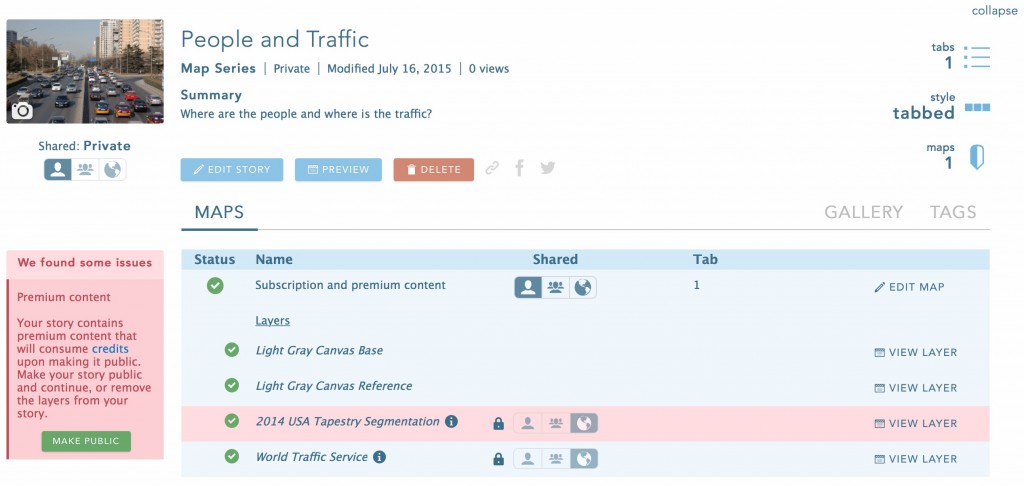 Organization members can now use My Stories to identify Story Maps with subscription or premium content layers and easily authorize them to be visible by anyone viewing your Story Map.