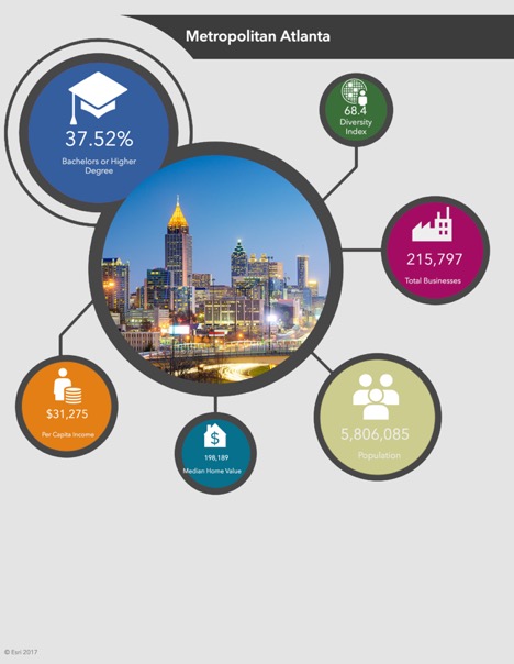 Atlanta, as a metropolitan area, is on the shortlist to become the home of Amazon’s HQ2. Let’s see how we can understand and visualize these factors for metro Atlanta from a data perspective using ArcGIS Business Analyst.