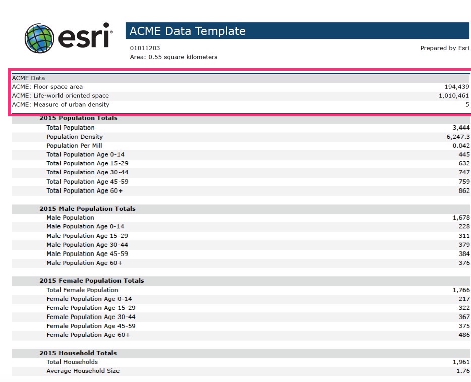 Another scenario will be, in case you are working on a global project and want to compare two target areas in Berlin, Germany for urban development. You need to provide market analysis reports to the city planners that help them understand urban density along with demographics. They prefer the data source for the urban density measure from a local data vendor (e.g. ACME data). You can easily bring in and use that data in the Business Analyst Web App to provide analysis reports to city planners and compare key economic indicators of two cities side by side.