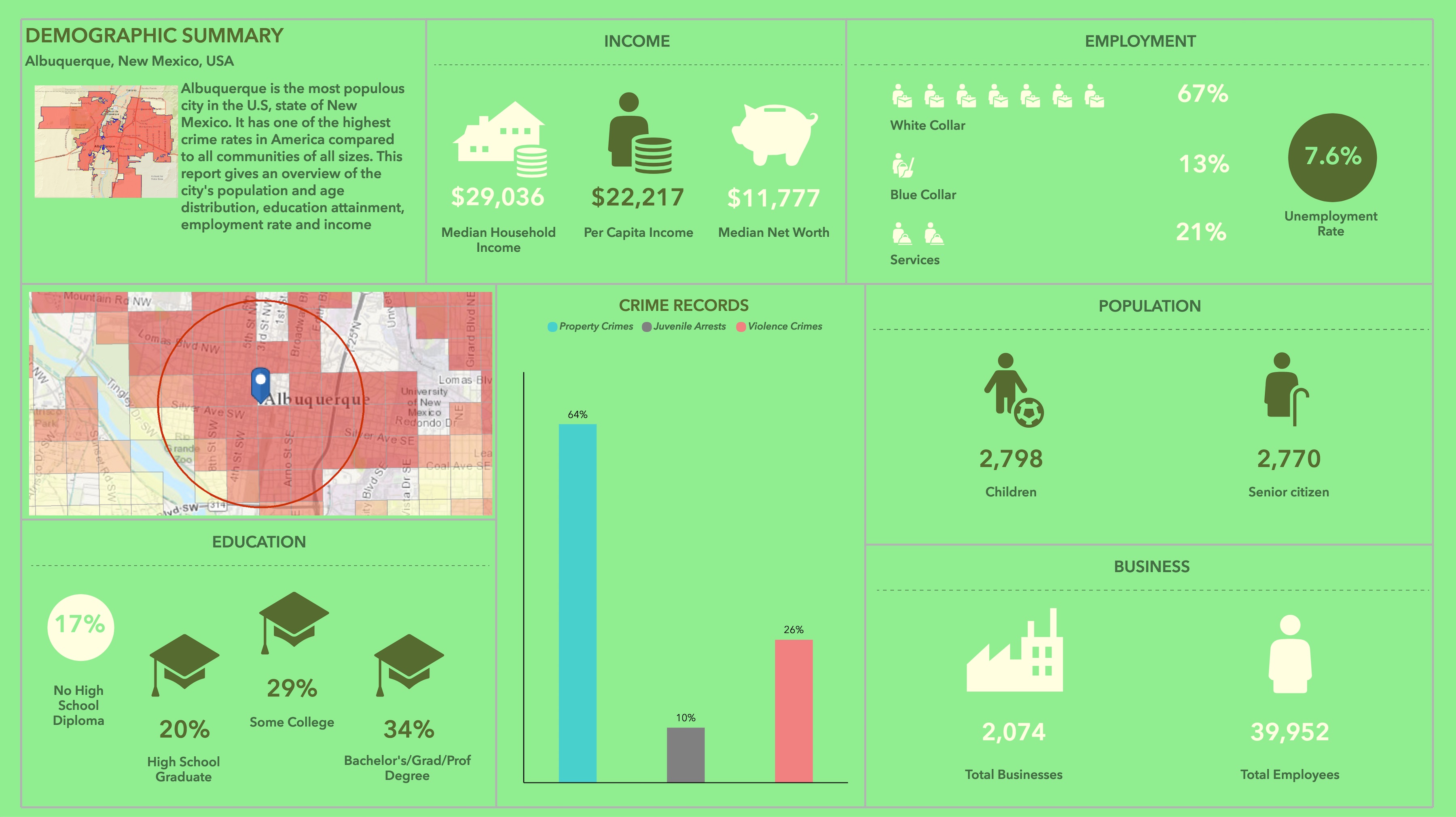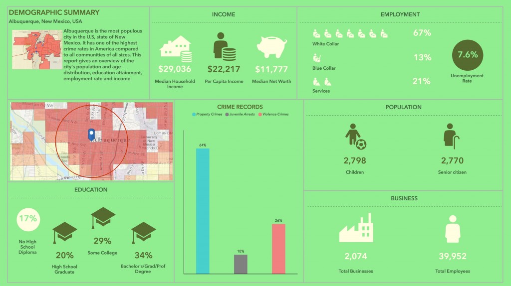 Or let’s say you work for a city, you have crime records data by Census Tracts, and you want to understand the correlation of crime statistics with demographics, identify areas with high population of children and senior citizens, and provide reports to help prioritize services in the most vulnerable areas. You can simply use the crime records data along with Esri’s population by age, key population, income, and household variables and create a beautiful and engaging infographics to present these key indicators.