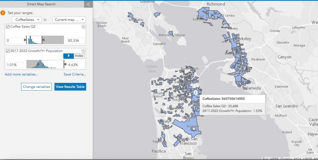 Imagine you run a chain of coffee shops and you have coffee sales data summarized by zip codes. You want to find zip codes with low sales and high population growth to identify areas where there is potential to grow your business. By using Smart Map Search on the coffee sales data along with the population growth data, you can easily find such zip codes and plan a targeted marketing campaign to help grow business.