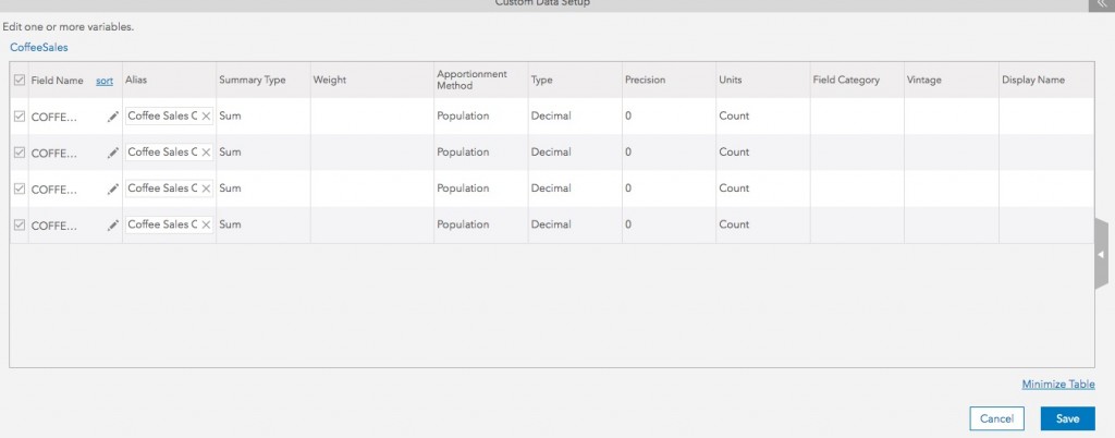 For example, Field category option gives you the flexibility to organize data variables in different folders. While, Apportionment Method defines how a variable is weighted to a portion of geography.