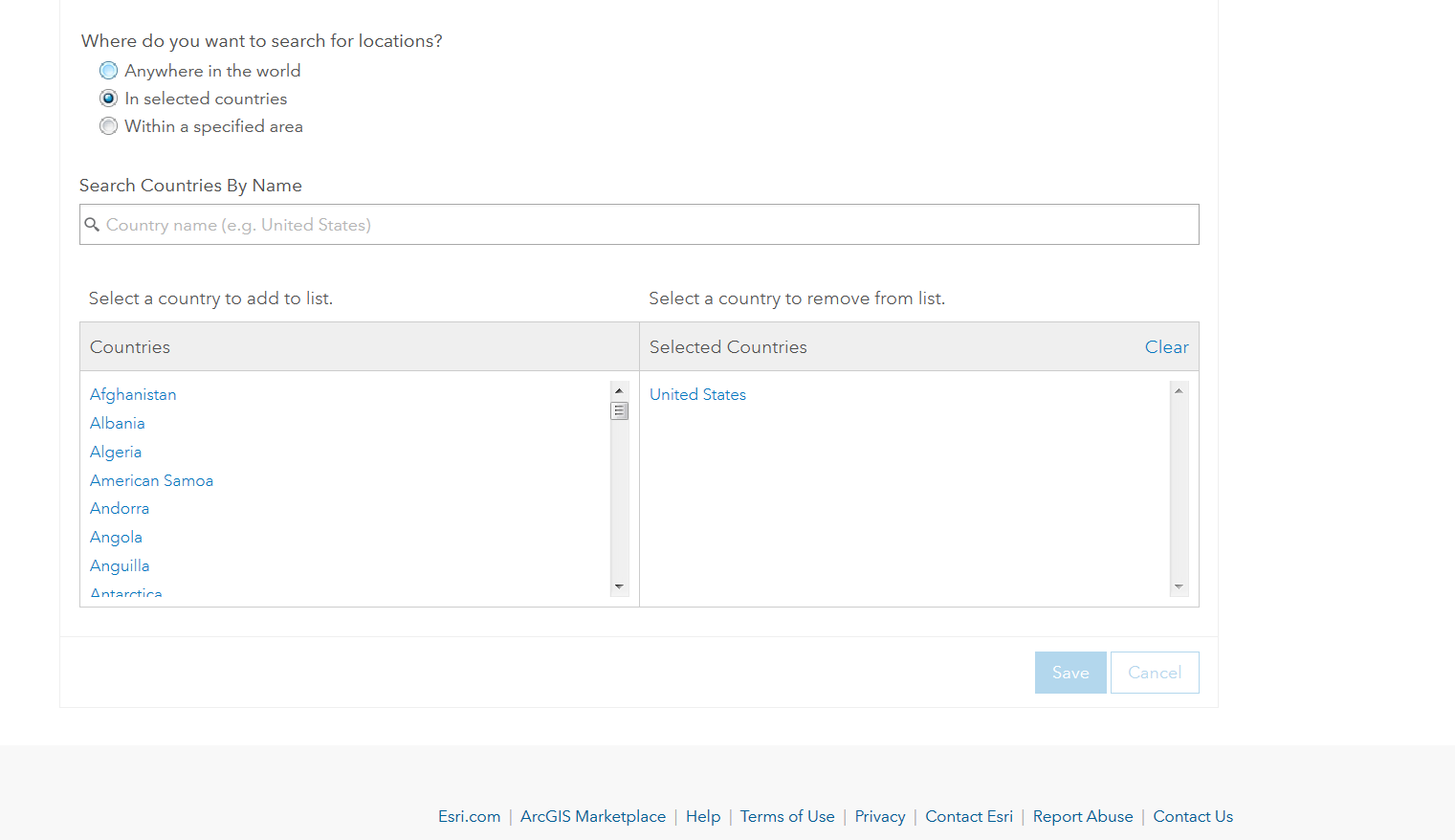 Within Settings page, you can define where you want to search for the location type you’ve selected. You can select Anywhere in the World, limited to Select Countries, or define a specific area of interest based on a rectangular extent that you define. I will select the country mode and choose ‘United States’.