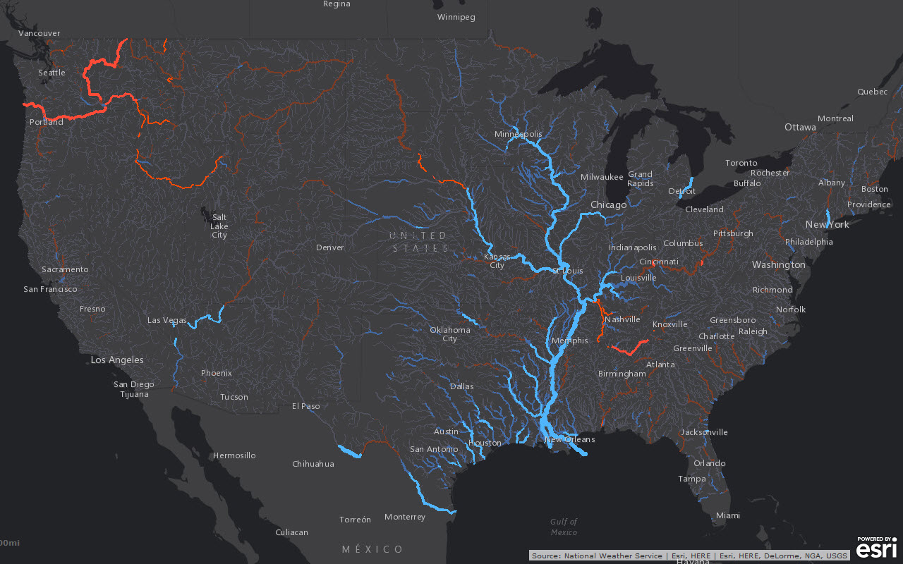 For the first time ever, you can visualize NOAA’s stream-flow forecasts throughout the continental U.S. in ArcGIS Online, ArcGIS for Desktop or freely via the REST endpoint. By accessing the National Water Model map services, hosted on Esri’s livefeeds2.arcgis.com server, you see the current state of our nation’s surface water network in addition to flow forecasts. Based upon a seamless National Hydrography Dataset and fed by NOAA’s National Weather Service forecast data, the National Water Model forecasts the flow of water along the 2.7 million stream segments in the U.S., aiding environmental resource managers and emergency managers alike. Esri’s map services are updated hourly, and forecasts can be viewed interactively in a time slider or played as an animation, providing an exciting view of how rainfall infiltrates the surface water network, and where it ultimately flows over time.