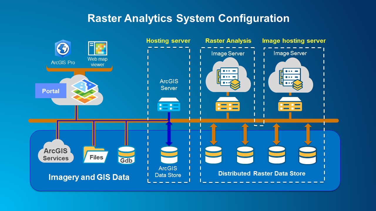 ArcGIS Image Server configured for the role of raster analytics provides software and user interfaces to organize and manage your processing, storage, and sharing of raster and feature data, maps, and other geographic information on a variety of devices. This integrated system manages the dissemination of processing and storage of results (1) on-premises and behind the firewall for classified deployments, (2) in cloud processing and storage environments, or (3) a combination of both environments.