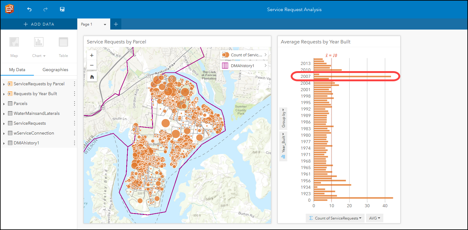 Because it is so easy to just dive into your data and ask questions, you can quickly arrive at results that inspire the next round of questions that may need asking. For example, the question “How does the age of a housing development relate to the number of leaks?” is quickly answered by examining the relationship between service request and parcel data. Aggregating the number of service requests to each parcel and then graphing the number of requests by parcel age might show an expected pattern—that older parcels generally receive more service requests. However, during your exploration you might also discover an outlier that does not fit the trend, such as the existence of one or two newer property developments with much higher than expected rates of service requests. That reveals the next question: Why are these new properties reporting more service requests than developments that are far older?