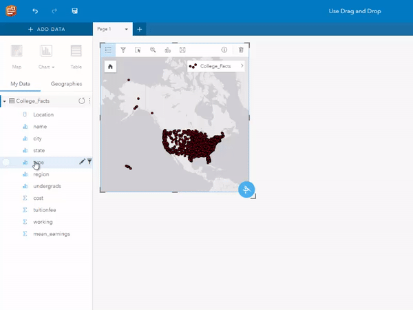 Dragging and dropping datasets or fields to create maps, charts, and tables is a great way to get started with your analysis. Have you ever found yourself with a new dataset that you wanted to explore but you didn’t know where to start? Try looking for fields that stand out to you and using drag and drop to change the style of your map or create a new chart. Style is changed when you drag a field onto an existing map for the same dataset and charts are created by dragging one or more field to the Create Chart drop zone.