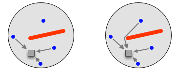 The main difference between IDW and Spline with Barriers, other than the algorithm, is the way in which the points that are to be used in the interpolation are defined. IDW uses a “line of sight” approach, which means that if a point can’t be “seen” because of a barrier, then it is not used to make the prediction at that particular location. Spline with Barriers, on the other hand, weights the points based on the shortest distance around a barrier. In the illustration below, IDW (on the left) will only use 3 points to make a prediction when a barrier intervenes. In contrast, Spline with Barriers will utilize all 4 points to make the prediction.
