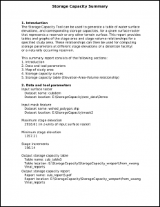 This tool can also generate a PDF report containing a map of the study area and the resulting elevation-storage relationships in both graphical and tabular form.
