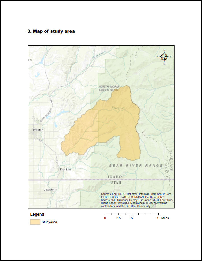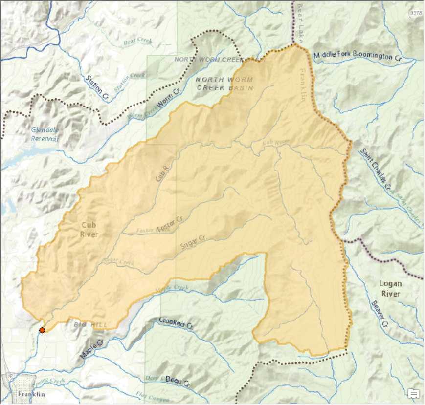 In order to understand what this tool does, let’s look at an example. I will use the Cub River Watershed draining to USGS streamflow gauge #100096000 located north of Preston, Idaho. The map below displays the study area for this site.
