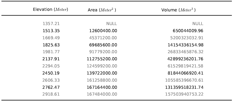 Based on your choice on minimum, maximum and incremental elevation, the tool computes the cumulative volume and surface area below an elevation for a given set of elevation values. The results of this computation are stored as a table. The table created for this example is shown below.