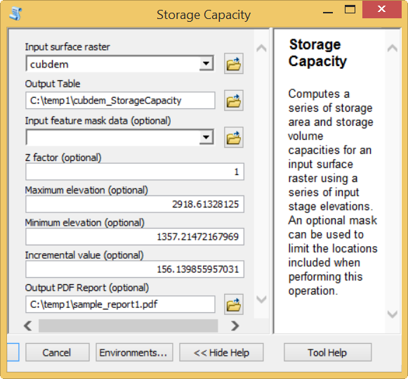Have you ever developed elevation-storage relationships for water reservoirs? Did you find it to be a manual and tedious process? Historically, this is not an unusual experience, especially if you needed to assess those relationships over multiple sites while maintaining a reasonably high degree of accuracy with your results. A fast and automated solution to this problem is now available with the introduction of the Storage Capacity tool to the Spatial Analyst Supplemental Toolbox. With this tool, it is possible to obtain tailored elevation-storage relationships for your reservoir of choice. Read on for more details on the capabilities this tool has to offer!