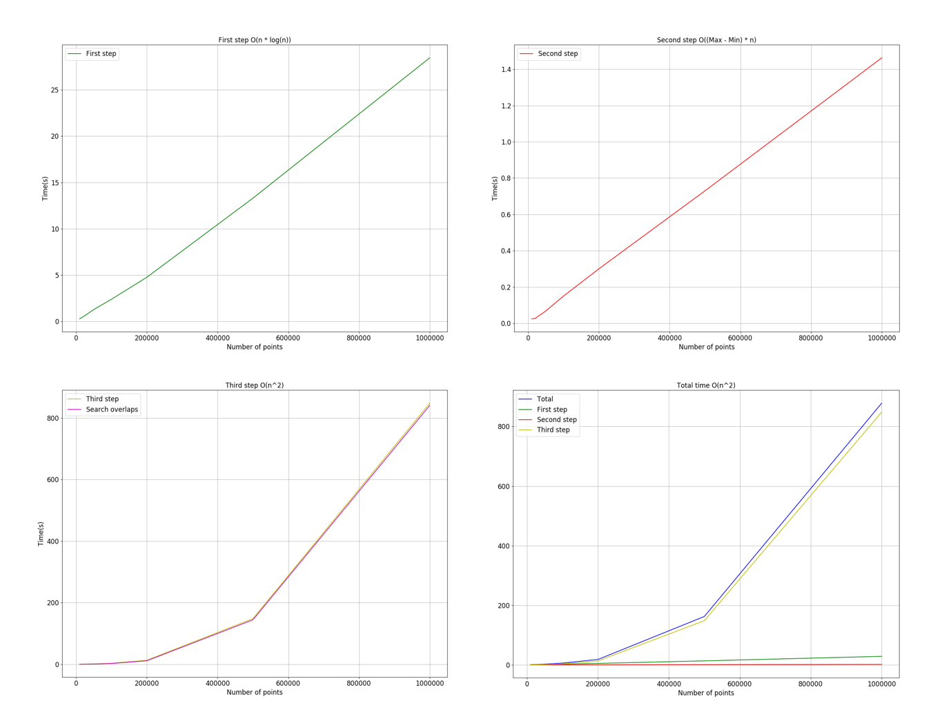 The figure below shows the time complexity of the three steps as well as each function plotted on the same graph. In the current implementation, the third step takes the vast majority of the computation time for large numbers of points.