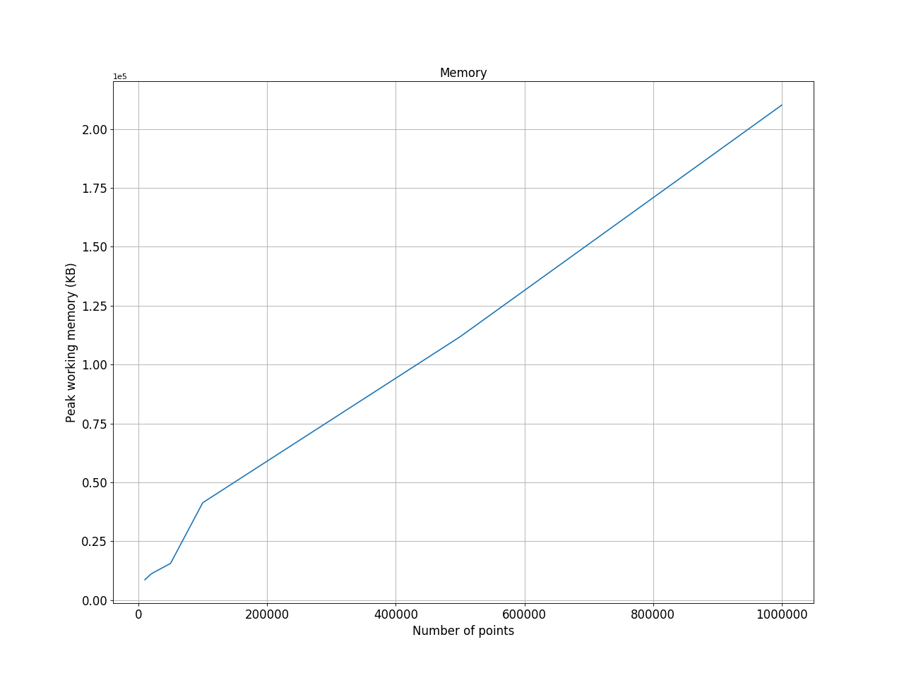 The space complexity of the algorithm is O(n), which means that the required memory is proportional to the number of points. The following image shows the memory allocation is linear with the number of input points.