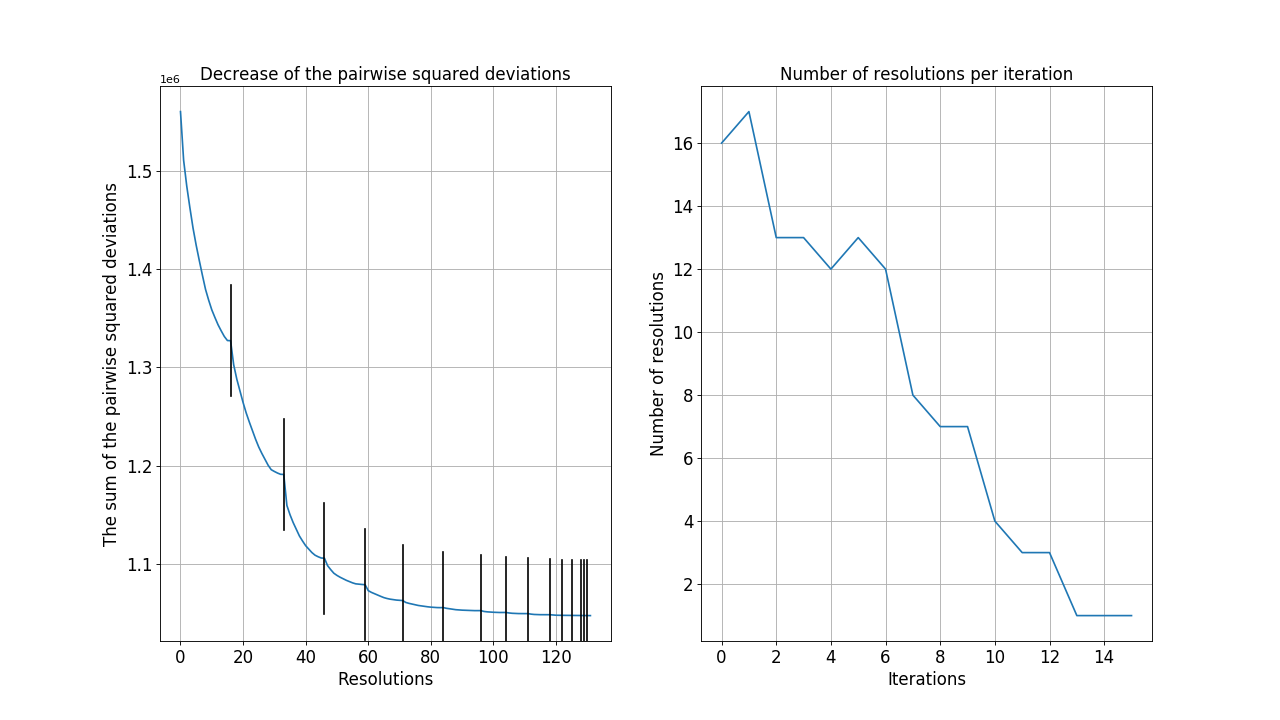 The following graphs show the analysis of the algorithm in the third step (resolution of overlapping subsets). When two subsets overlap, resolving their overlap reduces the total sum of the pairwise squared deviations. The graph on the left shows the decrease in the total sum after each resolution. The graphs on the right shows the number of resolutions in each iteration. For this data, the algorithm converges after about 14 iterations.