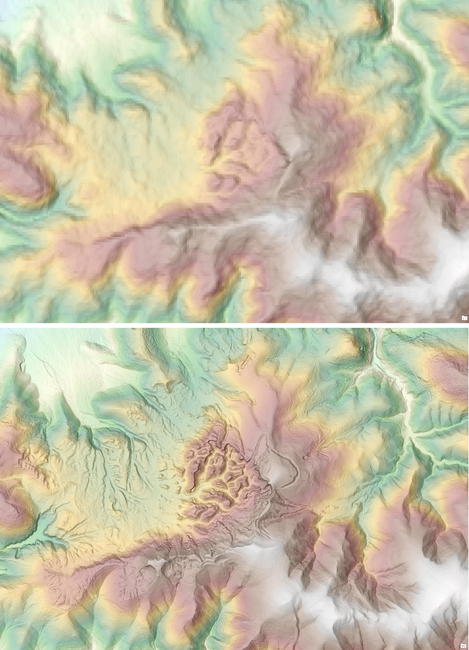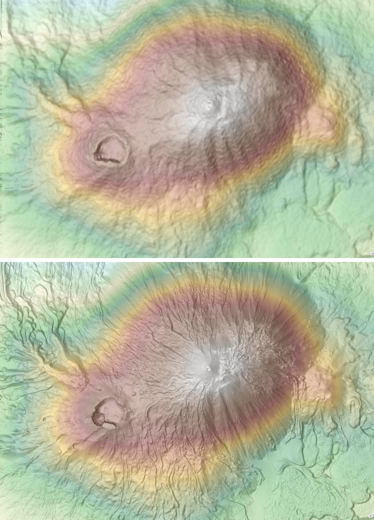 Teide-Pico Viejo stratovolcano, at 3,718 m, the highest peak in Spain located in Teide National Park, Canary Islands (a UNESCO World Heritage site), shows improvements using 5m lidar derived relief (bottom) over SRTM 30m (top).