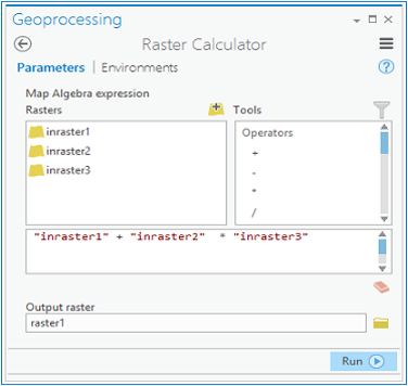 The look and feel of the Raster Calculator tool has changed a little bit in ArcGIS Pro. The numerical keypad was removed, but you can easily type numbers directly into the Expression window. The operator buttons have been moved to the Tools list. You can now browse to and add additional rasters to the expression directly, without have to add them to the Rasters list first.