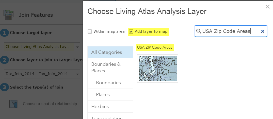 - Under step 1, select Choose Living Atlas Layer and type Zip into the search box. Check the Add layer to map check box and click the USA Zip Code Areas layer. Note. This layer has had the attribute and geometry optimized for use in the analysis tools. In the next step, I will exit the tool box to make some changes to this layer, but going through this workflow is the fastest way to find layers that are optimized for use in analysis tools.