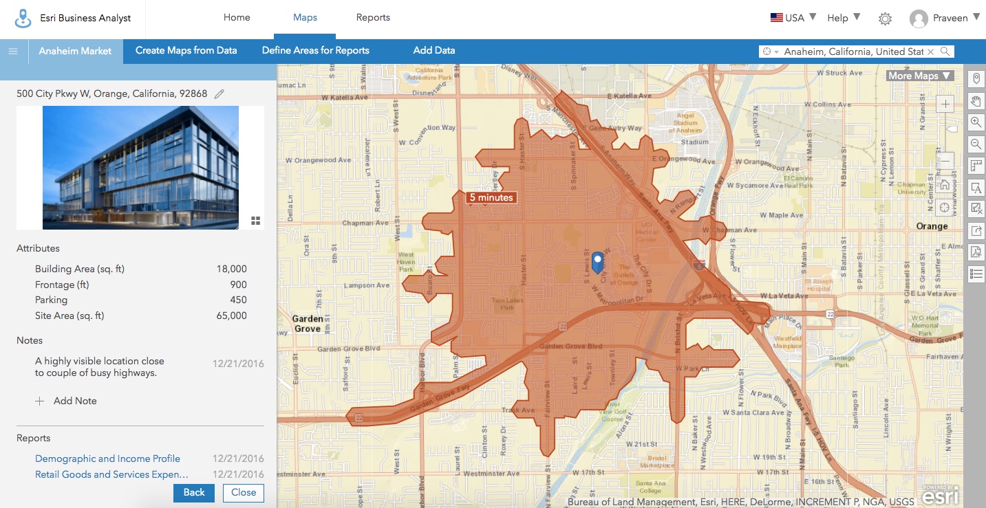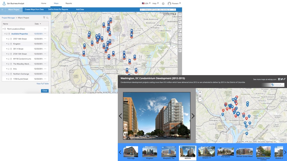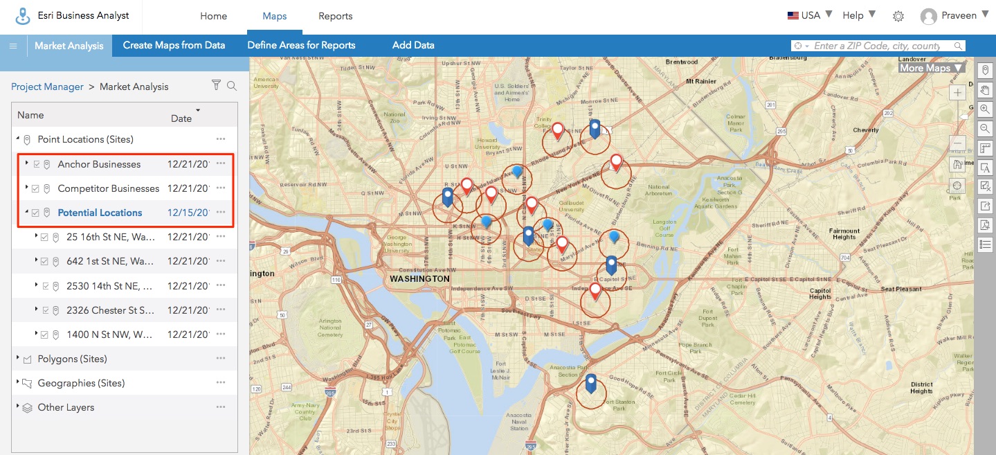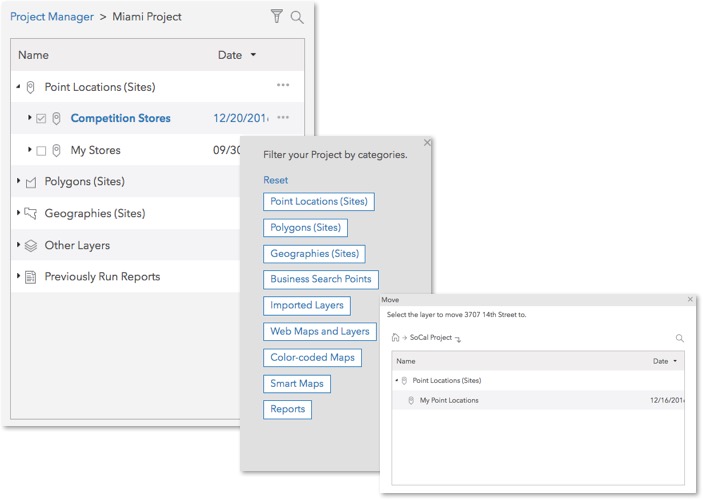 When performing location-based market and demographic analysis, you often create multiple sites, maps, layers, and reports. As you do analysis for various areas, this content keeps growing and becomes a bit hard to manage and organize. The new project structure enables you to manage your work more effectively and is aligned with the way your business works. You can organize your sites in layers, quickly filter and find content organized in the project panel, and easily move and share sites and layers between projects.