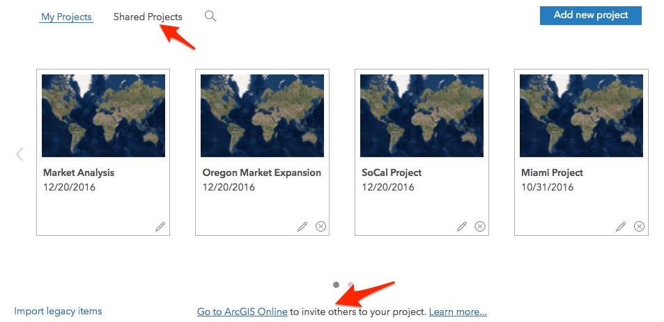 Projects enable you to share your work more easily with your team, stakeholders, clients, and decision makers within and outside your organization. For example, you could share a set of new proposed locations with another user or team within your organization. Or you can add a new potential site to a project shared with you by another user.