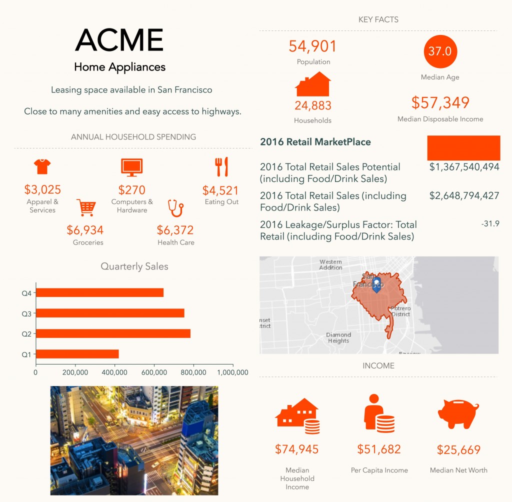 - 2017/2022 estimates and projections for U.S. demographics, daytime population, consumer spending, market potential, business data, and more