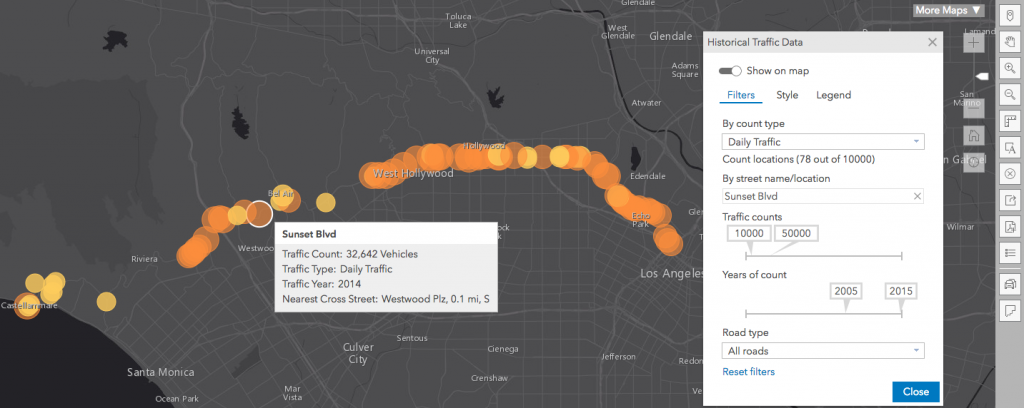 Map historical traffic counts data and visualize traffic patterns in the U.S. For example, you can easily determine the locations on Sunset Blvd in Los Angeles for the last 10 years where traffic count have been above 10,000.
