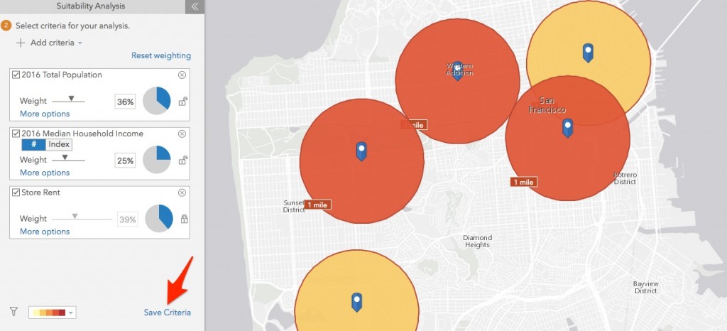 Run suitability analysis more efficiently and consistently by creating your suitability criteria once and using it for any set of locations. For example, let’s say your business has a weighted criteria for a set of demographic variables (e.g. population, income), custom data (e.g. sales) variables, and site attributes (e.g. rent and parking). You will be able to save this criteria and run it for selecting sites in San Francisco or Miami or Chicago.