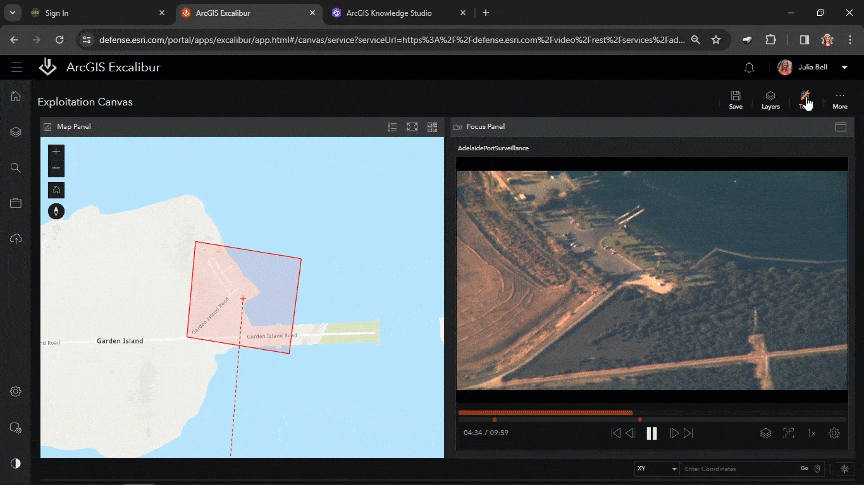 After utilizing ArcGIS AllSource and ArcGIS Knowledge on the desktop to identify the most influential location for this crime syndicate, the insights discovered can be used as a starting point for video surveillance operations. The newest server role, ArcGIS Video Server, is utilized through ArcGIS Excalibur. ArcGIS Excalibur is a web-based imagery and video analysis application that will enable search and discovery of aerial surveillance over the location of interest for exploitation.