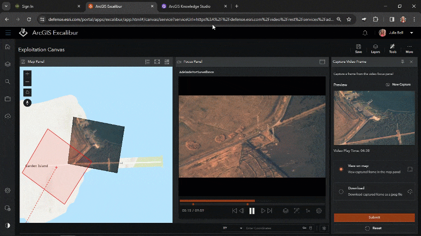 Additionally, in scenarios where analysts are lacking up to date imagery over a location of interest, a frame can be captured directly from the video and seamlessly viewed on the reference map to have better context of where observations are made.
