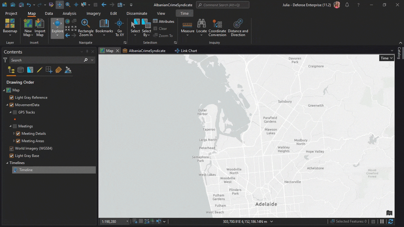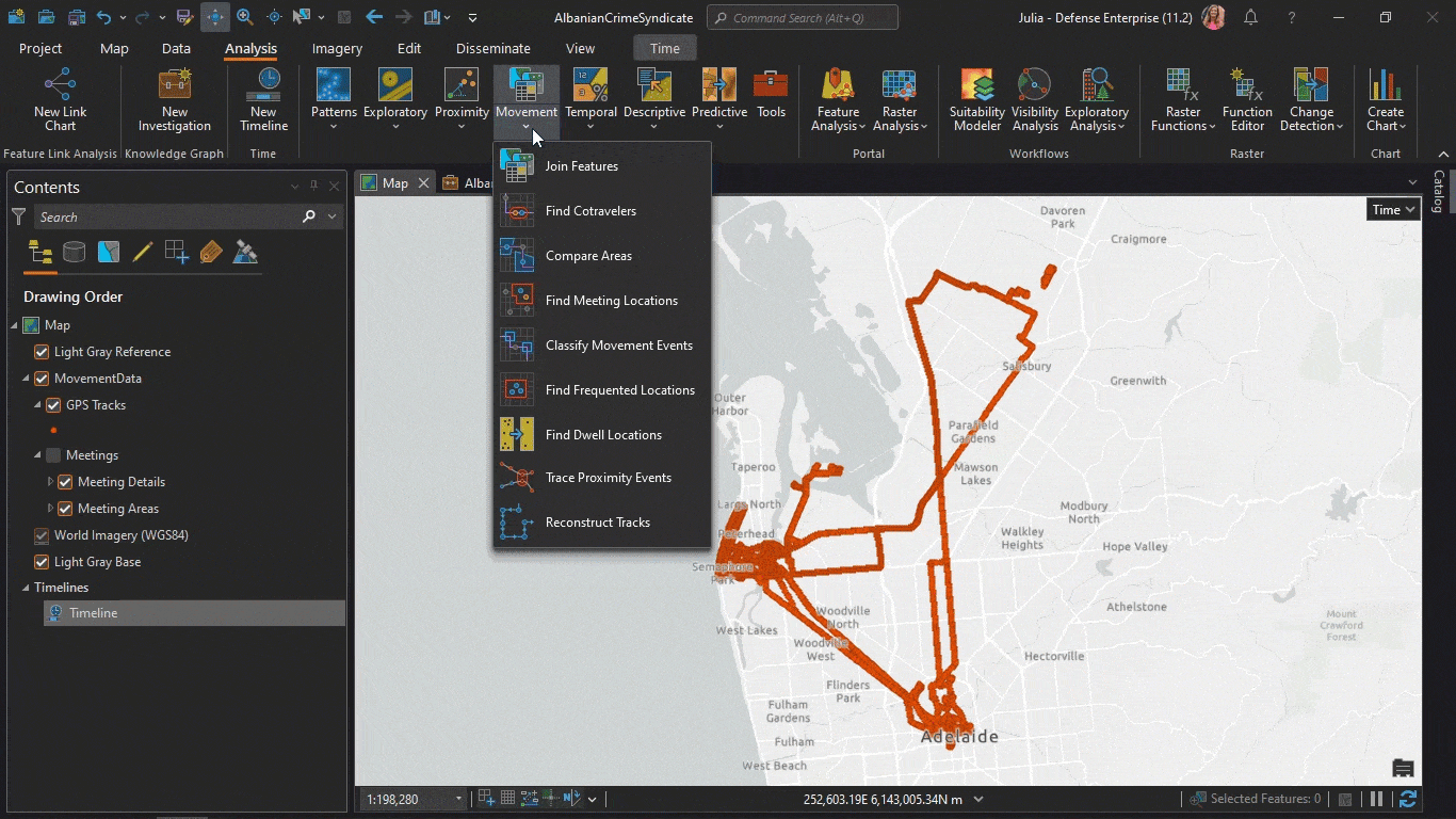 In the following notional example, the activities of a crime syndicate operating in Adelaide, Australia, are visualized. Utilizing the intelligence toolset in ArcGIS AllSource, particularly the movement tools, allows us better to understand the syndicate’s primary areas of interest. The movement analysis toolset will enable you to analyze point track data, including comparing tracks over different areas, extracting unique identifiers from a point track dataset, and identifying where tracks meet. This analysis will help identify potential surveillance locations in the future.