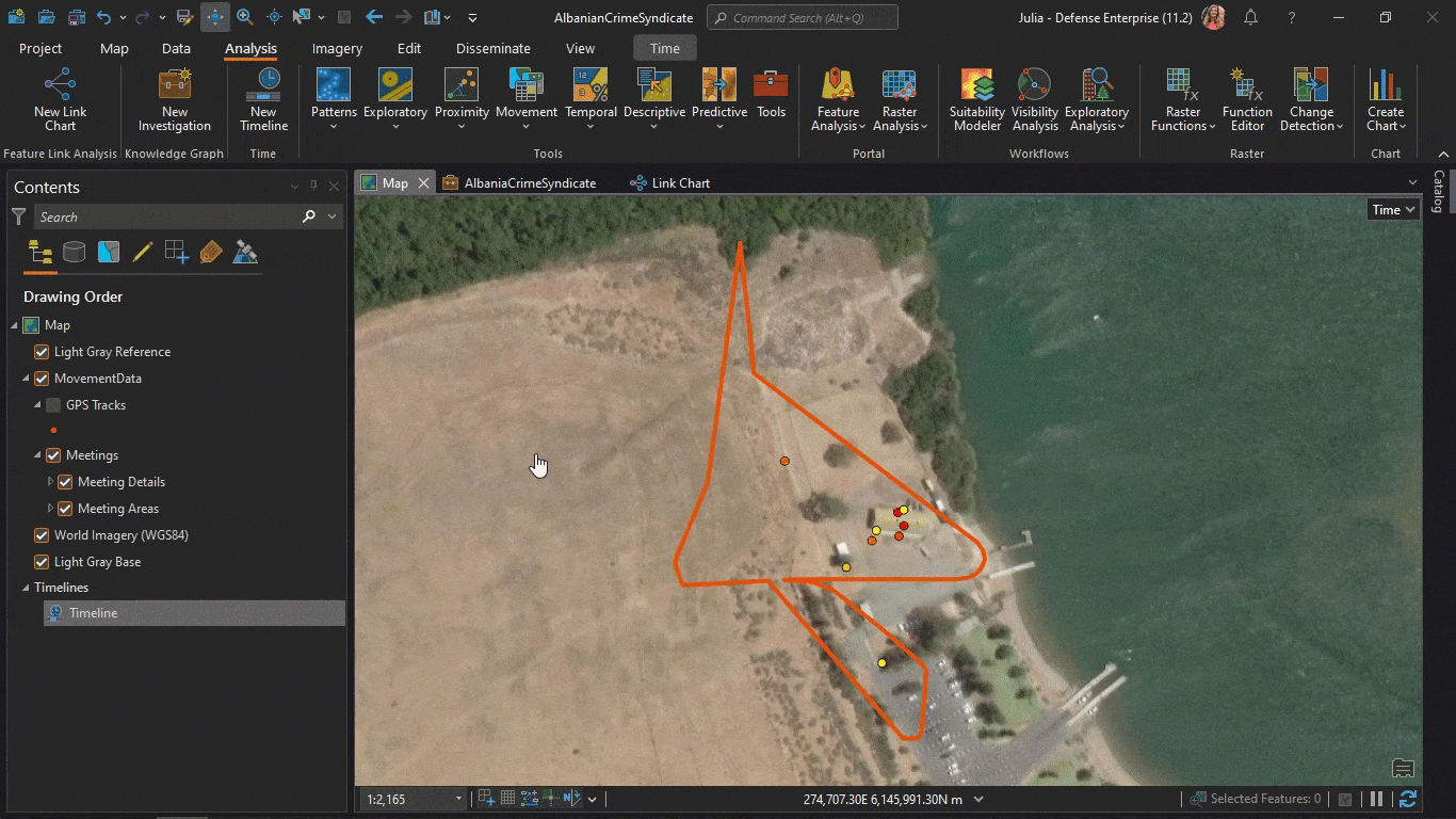 Focusing specifically on these areas of interest will help identify which locations would likely be the most prolific for future surveillance. Areas of Interest are added to a link chart, displayed as if drawn on a whiteboard, and complete with the robust symbology available through ArcGIS AllSource. This link chart will reveal which locations are of the highest value to prioritize the placement of surveillance assets.