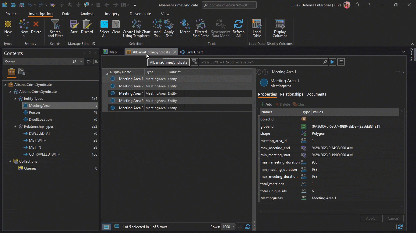 The geographic layout for the link chart allows me to visualize this data in a spatial context by positioning the location of interest entities on a map canvas according to their real-world locations. The nonspatial person entities they’re connected to are arrayed around them so the analyst can see all the data, especially the spatial data, in its proper geographic context.
